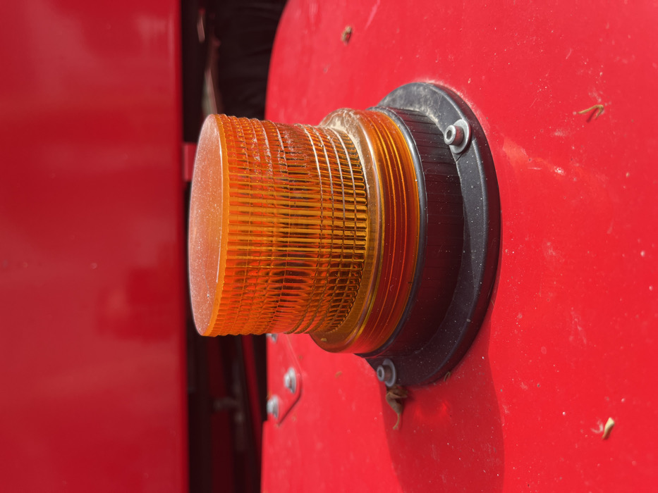 A cylindrical, amber-colored warning light is centrally positioned, mounted on a red, slightly textured surface