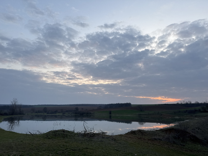 The image displays an expansive rural landscape near Sini Vir, Bulgaria, under a heavily clouded sky during either sunrise or sunset. A substantial body of water, likely a pond or small lake, occupies the mid-ground, reflecting the overcast sky and its underlying band of orange, pink, and pale yellow light. The foreground consists of a gently sloping bank covered in sparse green grass and patches of dark, exposed earth, with several fallen tree branches present near the water's edge. Beyond the water, the terrain includes rolling hills with cultivated fields displaying varying shades of green vegetation and reddish-brown tilled soil, interspersed with bare deciduous trees. A distinct tree line forms the distant horizon. No individuals, animals, or man-made structures are visible within the frame.