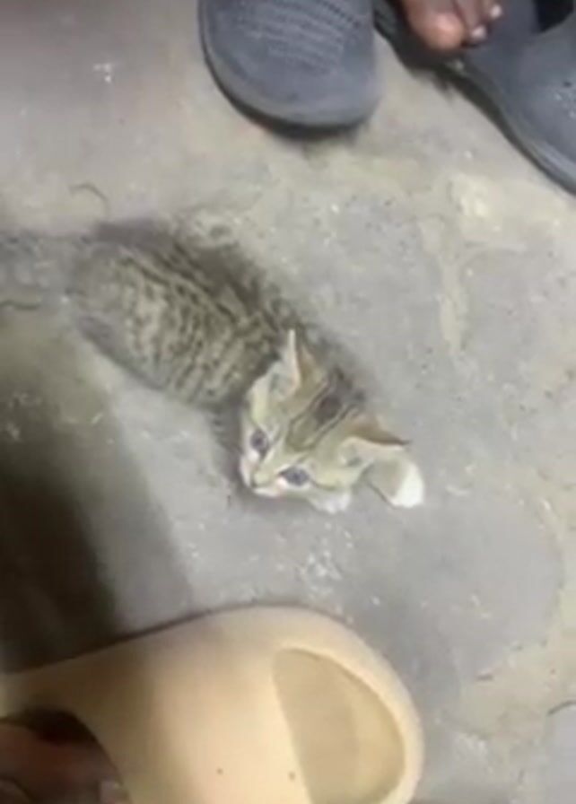 A kitten with tan and brown stripes and blue eyes lies on a concrete floor. It has a white paw. Around the kitten are several shoes: a pair of dark gray clogs, a single black clog and a pair of tan slides. A person's bare foot is visible next to the black clog.