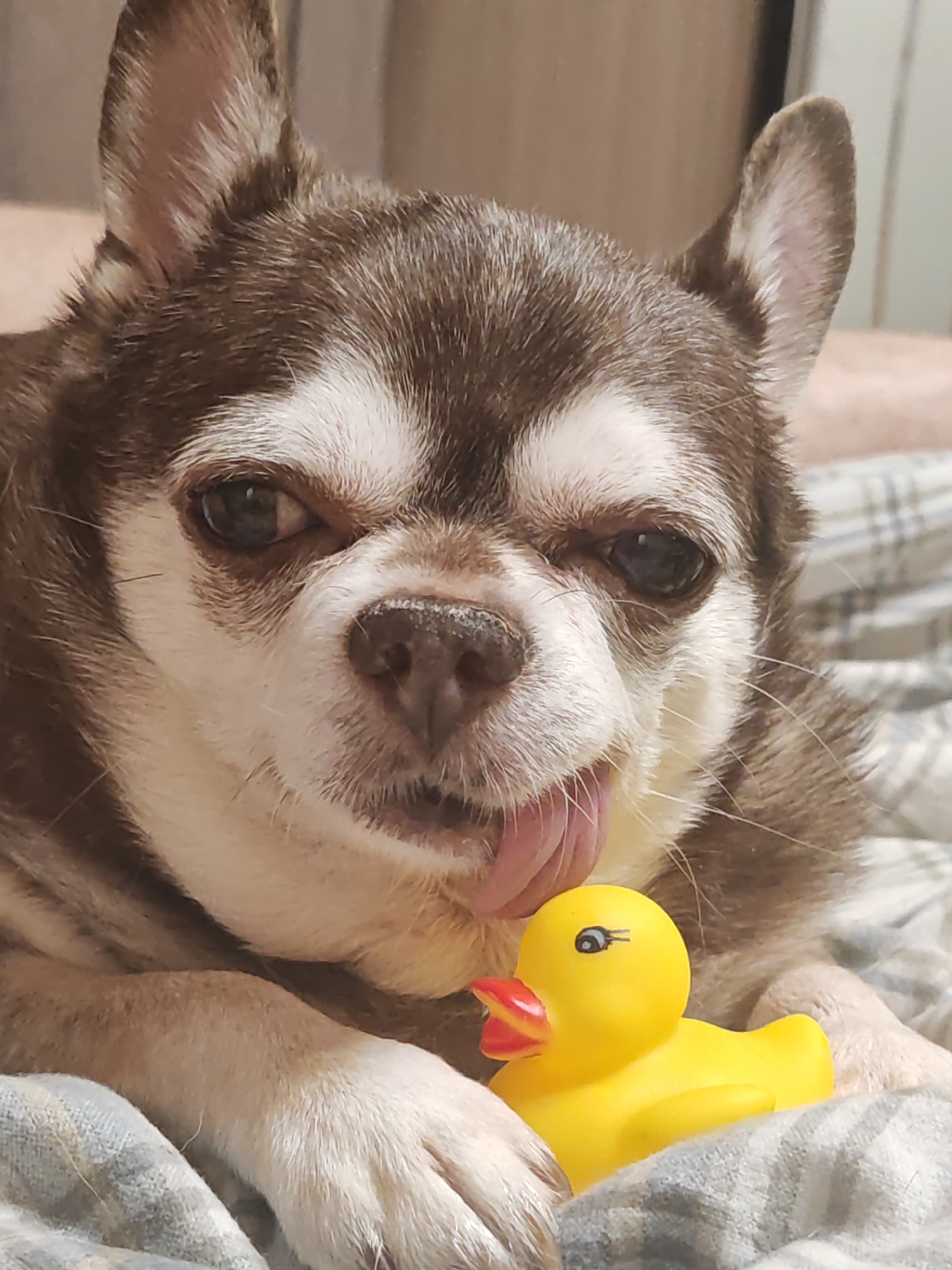 The image displays a close-up of a mature Chihuahua dog, predominantly brown with white markings on its face, chest, and paws, exhibiting graying fur around its muzzle. The dog is in a prone position, resting on a gray and white plaid fabric, likely a blanket or bedding. Its dark eyes are open and directed forward, and its ears are erect. The dog's tongue is extended, touching its lower jaw. A yellow rubber duck, featuring black eyes and an orange-red beak, is situated directly in front of the dog's chest, partially obscured by its front paws. The background is uniformly blurred, indicating an indoor setting. The specific location within the city of Saint Petersburg, Russia, cannot be determined from the visual information presented in the image.