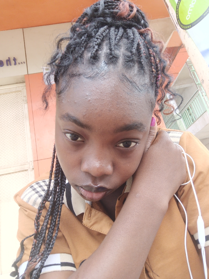 The image depicts an individual, likely female, in Fagge A, Nigeria, captured in a close-up outdoor shot. The person has dark skin, with visible acne on the forehead. Her hair is styled in dark braids with reddish-brown highlights, forming an updo and loose wavy tendrils around the temples. She wears a mustard yellow collared shirt with a black and white checkered pattern visible on the left shoulder and inside the collar. Her left hand is raised, with fingers touching the side of her head/ear, revealing light pink nail polish on the thumb. A white earphone cord, including a small rectangular control unit, is draped over her left arm and extends downwards. Her eyes are directed towards the camera with a neutral expression. In the background, to the left, is an orange building facade with partial purple text displaying "edt..." and a beige-colored rolling shutter with a diamond pattern. To the right, part of another building or structure is visible, featuring light green railings and a partial circular green sign with white text, including the word "omlo" and numbers such as "1923". The scene appears to be under daylight conditions.