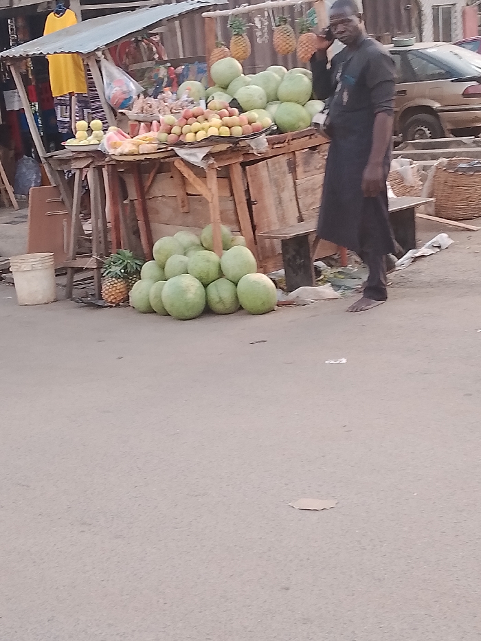 A street fruit vendor is on his mobile phone, standing barefoot near his merchandise. He has a wooden stand with pineapples hanging from the roof, along with apples, mangoes, and other fruits. Watermelons are stacked on the ground in front of the stand. A bucket sits to the side, and a car is visible in the background.