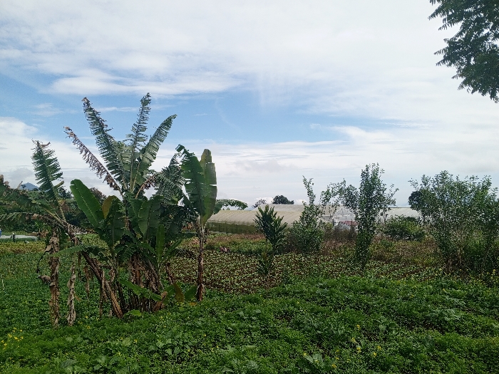 A rural landscape unfolds under a partly cloudy sky. Banana trees stand prominently amidst a lush field of green plants. Further back, a greenhouse structure is visible, flanked by various trees and shrubs. The foreground is dominated by a dense covering of vegetation. A tree partially obscures the upper right corner of the scene.
