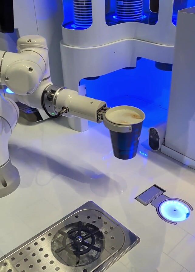 robotic arm placing a cup of coffee on a designated spot. The arm is white and has multiple joints, allowing it to move smoothly. The coffee is in a blue cup with a white lid. The cup is placed on a circular platform with a blue light. The surrounding counter is white, and there are other components of the automated coffee-making system visible, including a grate for spills and what appears to be liquid dispensers with blue lights. The scene is well-lit, and the focus is on the robotic arm and the coffee cup.