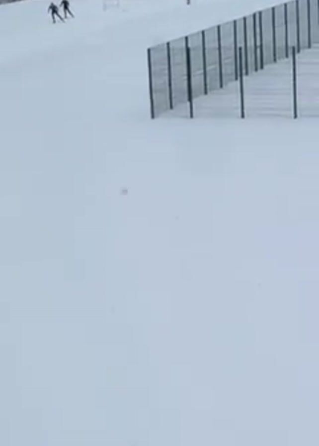 snowy landscape with people cross-country skiing. In the background is a small church with a golden dome and a red building. A black fence runs along the right side of the frame. Snow is falling. The camera pans up to follow the skiers. Two skiers pass along the fence line. The sky is overcast.