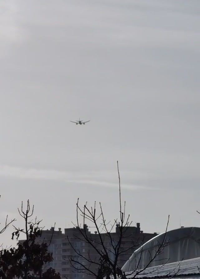 n airplane in the sky, appearing to approach the viewer. The sky is overcast, with white clouds. Below the plane, there are trees with bare branches, a building, and a structure with a white roof. The overall color palette is muted, with grays and browns dominating the scene. The camera is static.