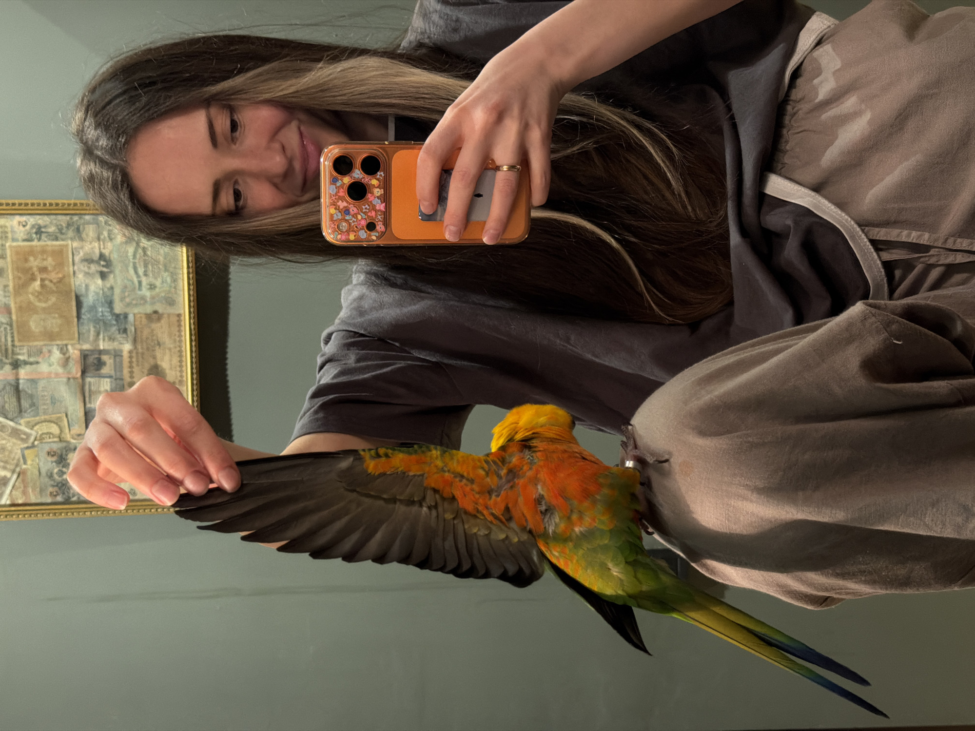 A woman is taking a selfie while holding a parrot. The woman has long, brown hair with blonde highlights and is wearing a gray t-shirt. She is holding an orange iPhone with a patterned case in her right hand. The parrot is brightly colored, with yellow on its head, orange and green on its body, and dark wings and tail feathers. The woman is extending her left hand to hold the parrot's wing. The background includes a muted green wall and a framed piece of art. It is not possible to determine the city of Khimki, Russia from the image.