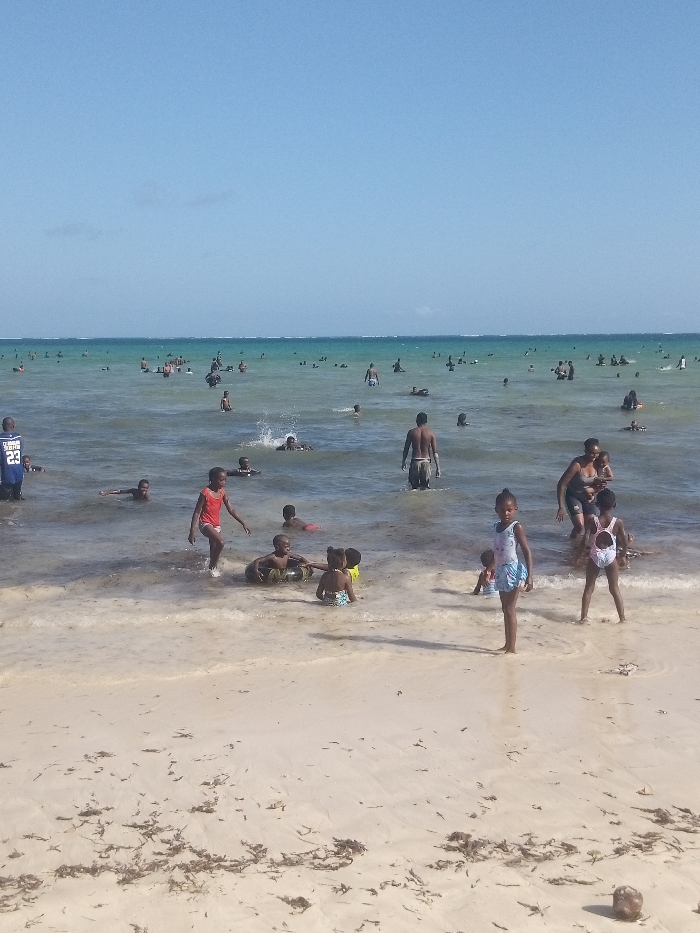 The scene depicts a crowded beach in Shanzu ward, Kenya, under a clear, bright blue sky