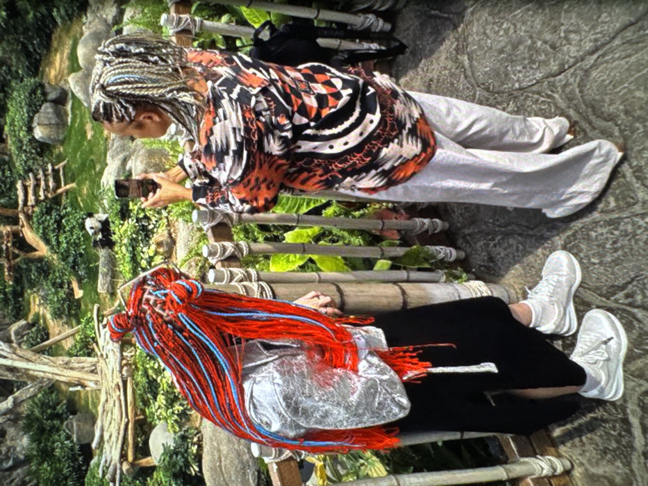 The image depicts an outdoor scene at a panda enclosure in Longhua District, China. Two adult females are observing the habitat from a paved walkway behind a bamboo-style railing. The woman on the left, facing slightly right with her back mostly to the viewer, wears a silver metallic jacket, black wide-leg trousers, and white athletic shoes. Her long, voluminous braided hair is vibrant red with interwoven blue strands. Her right hand is visible resting near the railing. The woman on the right, also facing mostly away but turned slightly left, wears a loose-fitting, long-sleeved shirt with a complex geometric pattern in black, orange, and white, paired with light grey trousers. Her lighter-colored braided hair is styled in two top buns. She holds a black smartphone horizontally with both hands, aiming it into the enclosure, appearing to take a photograph or video. A black bag hangs from the bamboo railing to her right. In the midground, a black and white giant panda is visible resting on the ground amidst lush green foliage and large rocks. The background features more greenery, a multi-tiered wooden climbing structure, and another flat wooden platform.