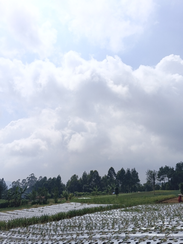 The image displays an agricultural landscape located in Nam Sa Lat, Myanmar. The upper two-thirds of the frame features a bright, partly cloudy sky, dominated by large, white to light-gray cumulus clouds with visible patches of light blue sky. A distinct horizon line is formed by a dense band of mixed trees, including conifers and broadleaf types, stretching across the midground. Distant, hazy hills are discernible behind the trees on the far left. The foreground comprises an expansive cultivated field covered with white plastic mulch sheeting laid in numerous parallel rows. Small green plants, consistent with young crops, emerge from circular cutouts in the mulch. To the far right of the foreground, a single individual, dressed in a reddish-orange garment and a wide-brimmed hat, is partially visible, standing within a section of greener, unmulched land.