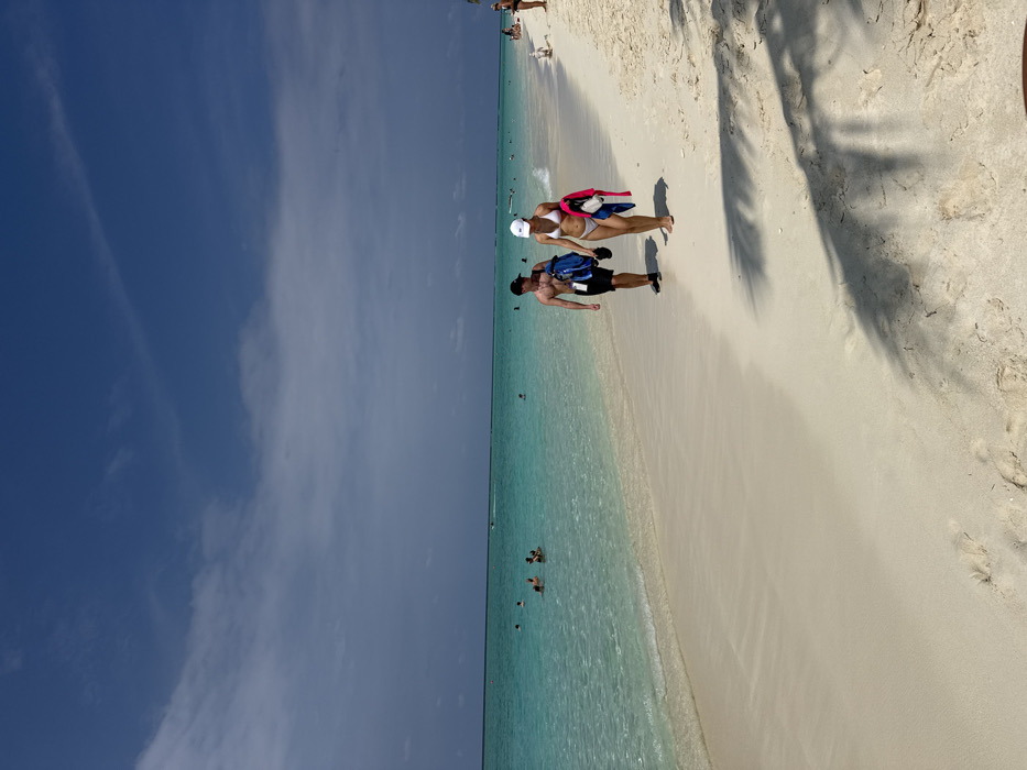A bright, sunny beach scene showcases a clear blue sky. The light-turquoise ocean gently meets the white sand. People are scattered along the shoreline and in the water. A couple, a man wearing a backpack and the woman in a white bikini with a pink coverup, are walking on the sand. The shadow of a palm tree stretches across the sand next to them.