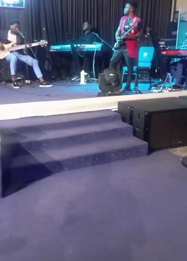 A gospel band performs on a stage. The band includes a bassist, a guitarist, and two keyboardists. The guitarist stands in the middle wearing a red shirt. The bassist is sitting down to the left of the guitarist. The keyboardists are behind them. The stage has blue carpet and dark blue curtains. There are a few speakers on the floor in front of the stage. A retractable stanchion blocks access to the stage.