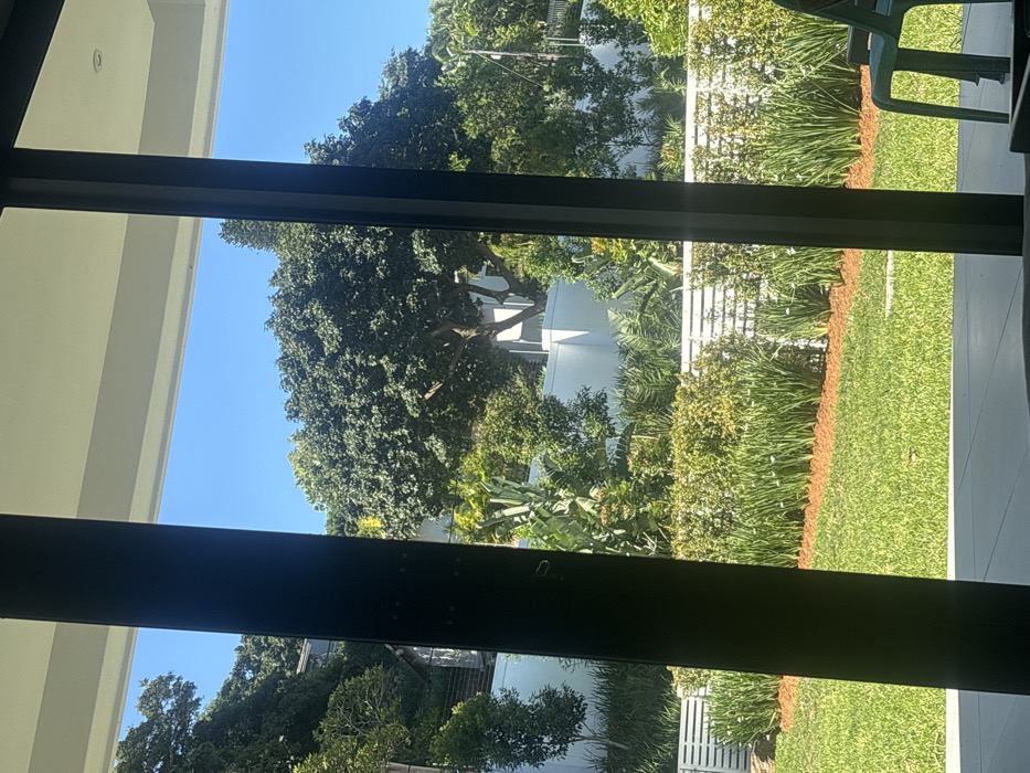 The image depicts an exterior garden scene viewed through a large window or glass door, with dark vertical frame elements partially obscuring the left and right sides. The setting is a bright, clear day in Durban, South Africa. In the immediate foreground, a grey paved surface is visible, and on the far right, the armrest and back of a light green plastic outdoor chair are partially present. Moving further into the scene, a well-maintained green lawn occupies the lower-center. Beyond the lawn, a strip of reddish-brown mulch borders a row of green, strap-leaved plants, some of which exhibit small white flowers. The midground features a low, white slatted fence running horizontally, partially obscured by dense green hedges. Behind this, a taller, solid white wall extends across the width of the frame, interspersed with various green shrubs and tropical-looking plants, including one with large, banana-like leaves. A prominent, mature tree with a dense green canopy stands centrally, partially obscuring distant structures. The background consists of a heavily vegetated hillside covered with numerous green trees and shrubs. Portions of white residential buildings are visible nestled within the foliage on the hillside. The upper section of the image shows a clear, bright blue sky. No individuals, actions, or interactions are depicted within the scene.