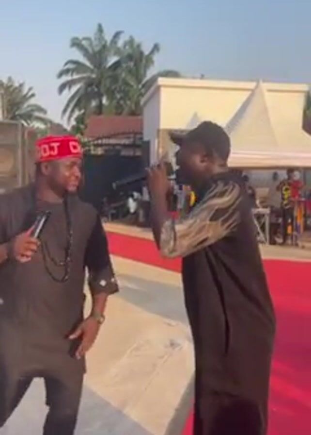 Two men are standing outside on a paved surface. A red carpet leads to a white house with a fenced entrance. The man on the left wears a black outfit, a red hat with white text, and a necklace. The man on the right is wearing a black vest and a black cap. Both men are holding microphones and appear to be singing or speaking. In the background, there are other people, some trees, and a building. The sky is blue.