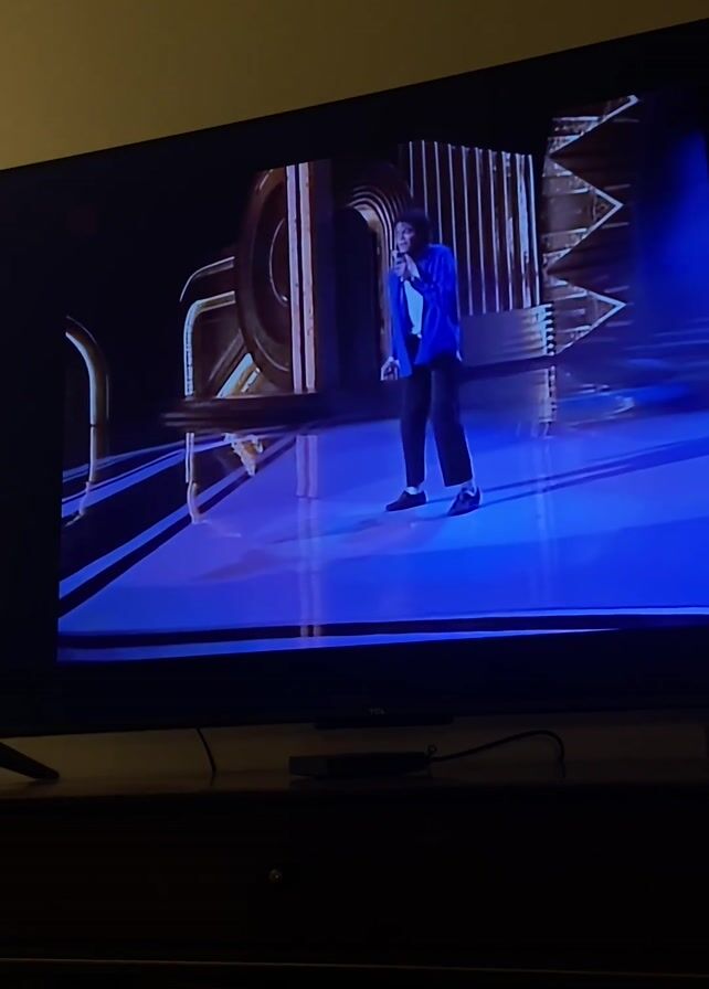 A television shows a singer on stage in front of a set with metallic accents