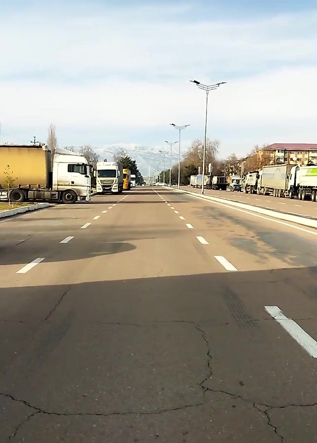 The video presents a street scene in an upside-down orientation. The perspective is from the roadside, looking down a wide asphalt road marked with white lane lines. Several vehicles, mainly trucks, are parked along the road. Buildings and bare trees line the opposite side. In the distance, snow-capped mountains are visible. The sky is partly cloudy. A portion of a dark gray trailer truck is visible on the right side of the frame. A white van is parked closer to the camera, near the trailer.