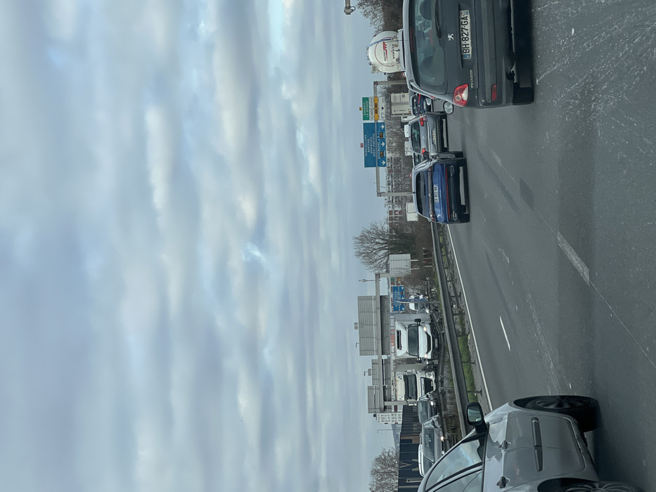 The image depicts a multi-lane highway on an overcast day, experiencing heavy traffic. The scene is located in Saint-Denis, France, on the A1 Autoroute du Nord, heading northbound, specifically near the exits for Saint-Denis Centre, Aéroport Charles de Gaulle (CDG), and routes A1 and A104, which are indicated on overhead gantry signs. In the immediate foreground, to the right, is the rear of a dark grey Peugeot hatchback displaying French license plate BH-827-GA. To its left, partially visible, is the side profile of a silver or light grey sedan. Further ahead in the rightmost lane is a blue SUV with French license plate EX-603-BB. The roadway shows multiple lanes of slow-moving or stopped vehicles, including cars, a white refrigerated van (Iveco Daily) in the center-left, and a white semi-truck (DAF) next to it. A white tanker truck is visible further down the right lane. The road surface appears dry but exhibits some light white streaking or residue. Overhead, multiple road signs are mounted on gantries. A prominent blue sign on the left directs traffic to "SENNEVILLIERS", "GENNEVILLIERS", "ST-DENIS CENTRE", "AEROPORT CDG", "A1", "LILLE", and "BRUXELLES". A green sign to its right specifies "AEROPORT CHARLES DE GAULLE", "SOISSONS", "A104", and "Marne-la-Vallée". A metal safety barrier separates the traffic flow. The environment flanking the highway includes bare trees, some fencing, and several buildings in the background. On the left, multi-story structures with flat roofs are visible, while on the right, additional buildings and a distant telecommunications mast or tower are present. The sky is uniformly covered with light grey stratocumulus clouds. No individuals are visibly outside of vehicles.