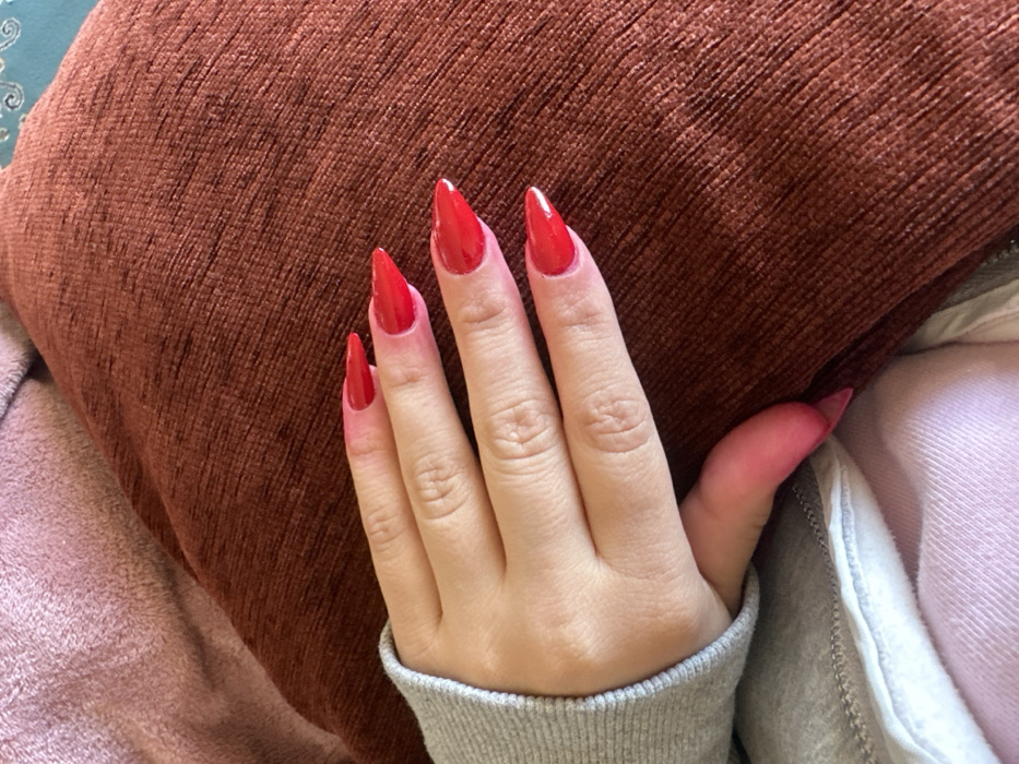 A close-up, top-down view in the city of Unknown, Unknown, shows a fair-skinned left hand resting on a textured, reddish-brown fabric object, likely a cushion. The hand displays five fingers, all adorned with glossy red, stiletto-shaped artificial nails. Visible natural nail growth is present at the cuticle line of each nail. The subject's wrist and lower forearm are covered by a light grey long-sleeved garment. A segment of a light pink or mauve fabric is visible in the background to the upper left, and also partially beneath the grey sleeve near the thumb.