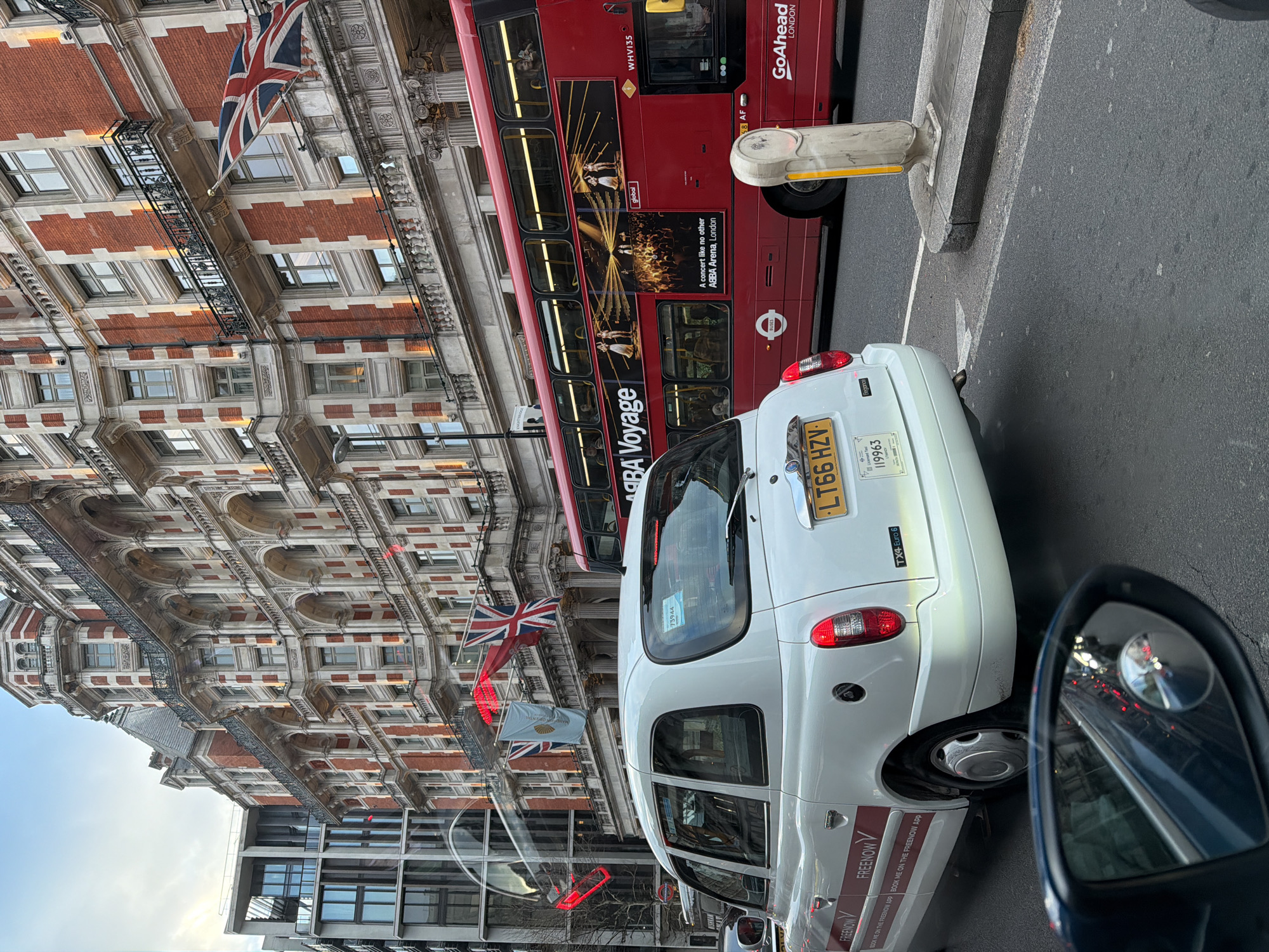 The image captures a street scene in London, United Kingdom. A white taxi cab, with the license plate LT66 HZV, is positioned next to a red double-decker bus advertising ABBA Voyage, with the GoAhead London logo visible. A building with ornate brick and stone facade is on the left, decorated with Union Jack flags and a blue flag of Mandarin Oriental. The modern glass and steel building can be seen in the distance. The side mirror of another vehicle is visible on the right side of the image.