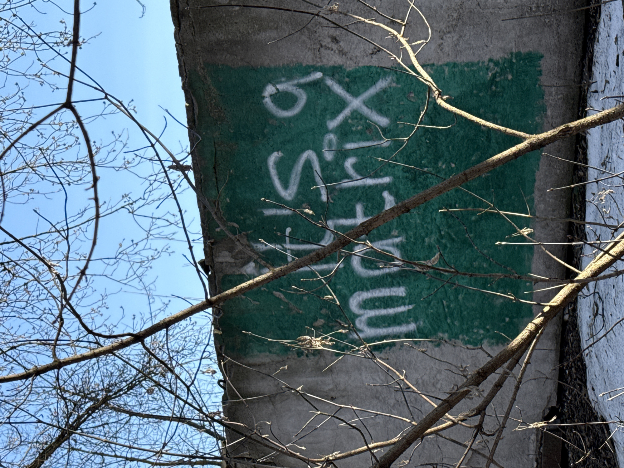 A concrete structure, possibly a bridge support or wall, is partially obscured by bare tree branches against a blue sky. A rectangular green patch is painted on the concrete. White graffiti-style text is overlaid on the green patch. The text appears to be "6Xstm." The exact location cannot be determined.