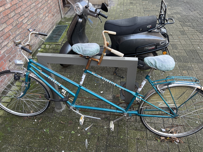- "A teal tandem bicycle, labeled "Flandria," is secured to a metal bike rack next to a dark gray scooter" by FM-AuMyu1, licensed under CC BY 4.0