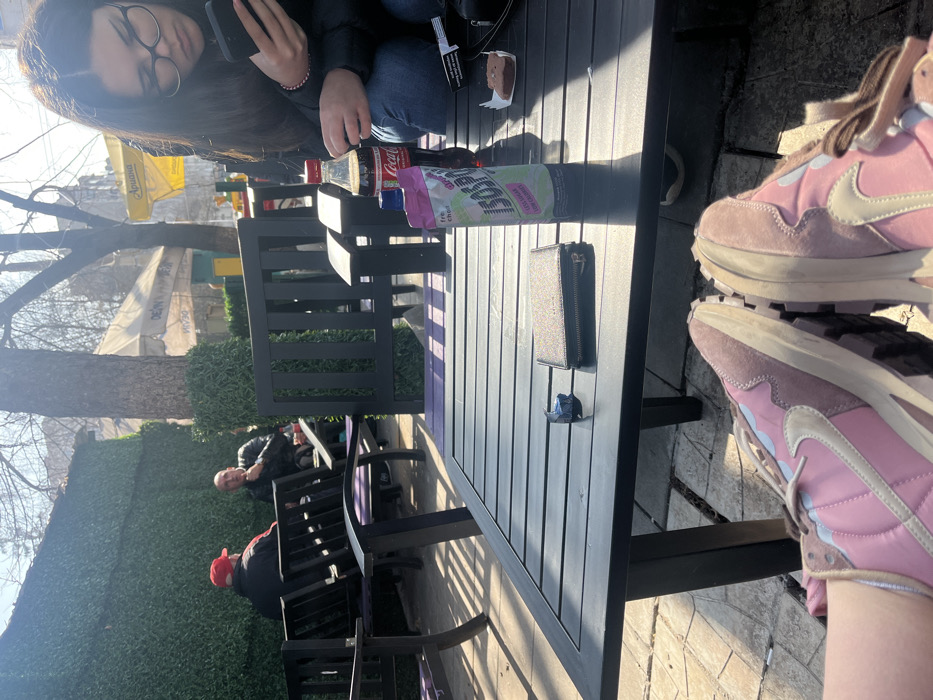 The image presents an outdoor cafe scene in Sofia, Bulgaria, identifiable by the "АРУАНА" and "ДЕВИН" signage on distant canopies. The perspective is from a seated individual, with their feet, clad in pink and beige Nike sneakers, visible on a light-colored paved ground in the immediate foreground. A dark, slatted rectangular table occupies the center. On its surface, from left to right, are a crumpled blue wrapper, a dark, glittery zippered wallet, a pink and green "ISOSPORT" isotonic drink carton, a small plastic Coca-Cola bottle with a red cap, and a brown, rectangular snack bar partially wrapped in white paper. To the right of the table, a young woman with long dark hair and glasses is seated, wearing a dark jacket and blue jeans. She is actively engaging with a black smartphone held in her hands. In the mid-ground, behind the main table, additional dark outdoor tables and chairs with purple cushions are arranged against a tall green artificial hedge. Two men are seated at one of these tables. The man on the left wears a red baseball cap and a dark jacket, facing away from the camera. The man to his right has a bald head and a dark jacket, looking towards the left. The background reveals a sunny day with distinct shadows. Bare-branched trees, light-colored urban buildings, and two large canopies are visible. One canopy is yellow with "АРУАНА" written in Cyrillic; the other is white with "ДЕВИН" partially visible.