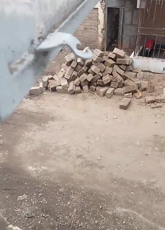 top-down view of a pile of small, rectangular stones or bricks lying on a concrete surface. The stones are brown and unevenly stacked. To the left of the stones is a metal railing with a hook-shaped element. The concrete surface is dirty with various debris scattered around. In the background, some wooden planks and parts of what appears to be a building structure can be seen. The overall lighting is dim, casting shadows on the surface. The camera seems to be positioned at an elevated height, looking down at the scene.