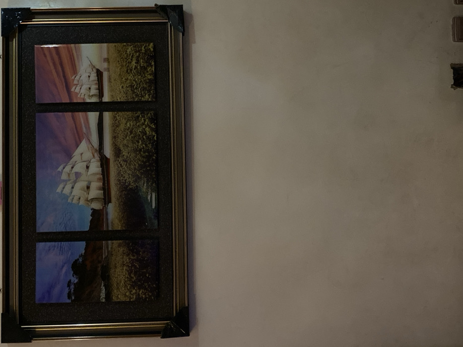 An indoor scene in Sabon Gari East, Nigeria, presents a framed triptych artwork mounted on a plain, light beige-painted wall