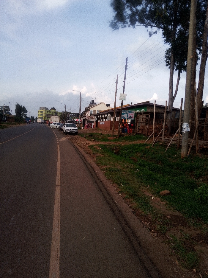 The scene depicts a rural or semi-urban roadside environment in Nachu ward, Kenya, viewed from a slightly elevated position looking down a two-lane asphalt road