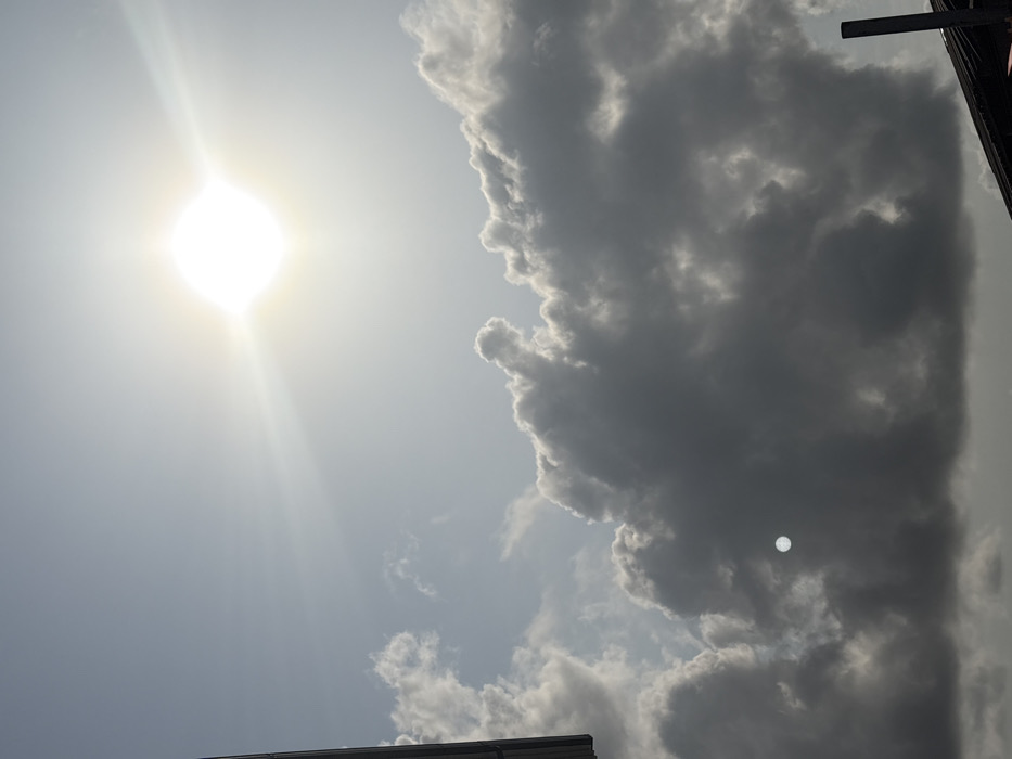 The image displays a daytime sky over Igboefon, Nigeria, dominated by varying cloud formations and a prominent sun. The upper right portion of the frame features a brilliant, intense sun emitting strong rays, creating a bright glare against a light grey-blue sky. Below the sun, a significant mass of dense, dark grey cumuliform clouds extends across the middle and lower sections of the image. Within this dark cloud mass, in the lower-middle left, a distinct, luminous white spherical object resembling a full moon is visible, exhibiting a softer glow compared to the sun. In the upper left corner, a dark, angular, man-made structure, possibly a roofline or part of a building, is partially visible, extending vertically into the frame. In the lower right corner, a dark, vertical cylindrical object, potentially a pipe or pole, rises from the bottom edge, with a faint dark roofline visible beneath it, partially obscured by the cloud cover. No individuals, actions, or specific interactions are discernable within the frame.