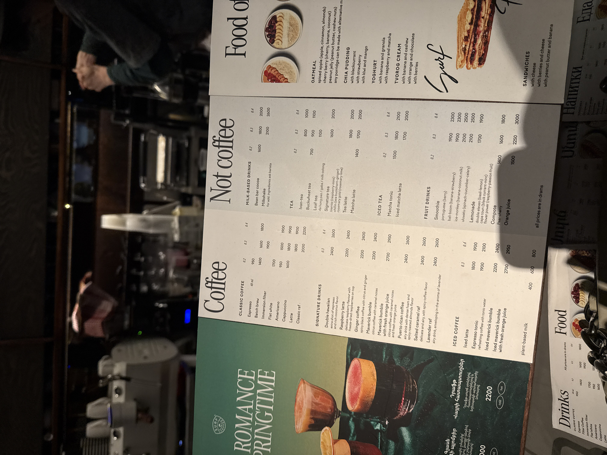 menu in Yerevan, Armenia. The menu is divided into three sections: "Coffee", "Not coffee", and "Food of". The "Coffee" section lists various coffee drinks with their prices, including classic coffee drinks and signature drinks. The "Not coffee" section lists milk-based drinks, teas, iced teas, and fruit drinks. The "Food of" section lists oatmeal, chia pudding, yoghurt, and tvorog cream. The bottom right corner of the menu displays various food items like sandwiches and other local Armenian cuisine. All prices on the menu are listed in drams. The image includes text in Armenian.