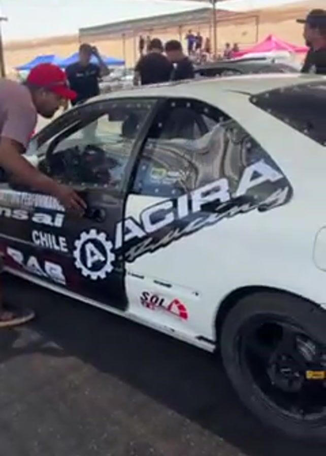Here's a detailed description of the video: The video shows a white Honda Civic race car, heavily modified with decals and racing parts, at a drag strip. The car has a roll cage visible through the window, indicating it's designed for racing. Decals such as "ANSIA Performance Chile," "CHULZ Renewable," and others are visible on the car's body. A large exhaust outlet is present at the rear. The car has a Japanese license plate. Around the car, people are standing and observing. Some are wearing t-shirts and caps, suggesting they are part of the pit crew or spectators. The setting is an outdoor race track on a sunny day, with tents and support vehicles visible in the background.