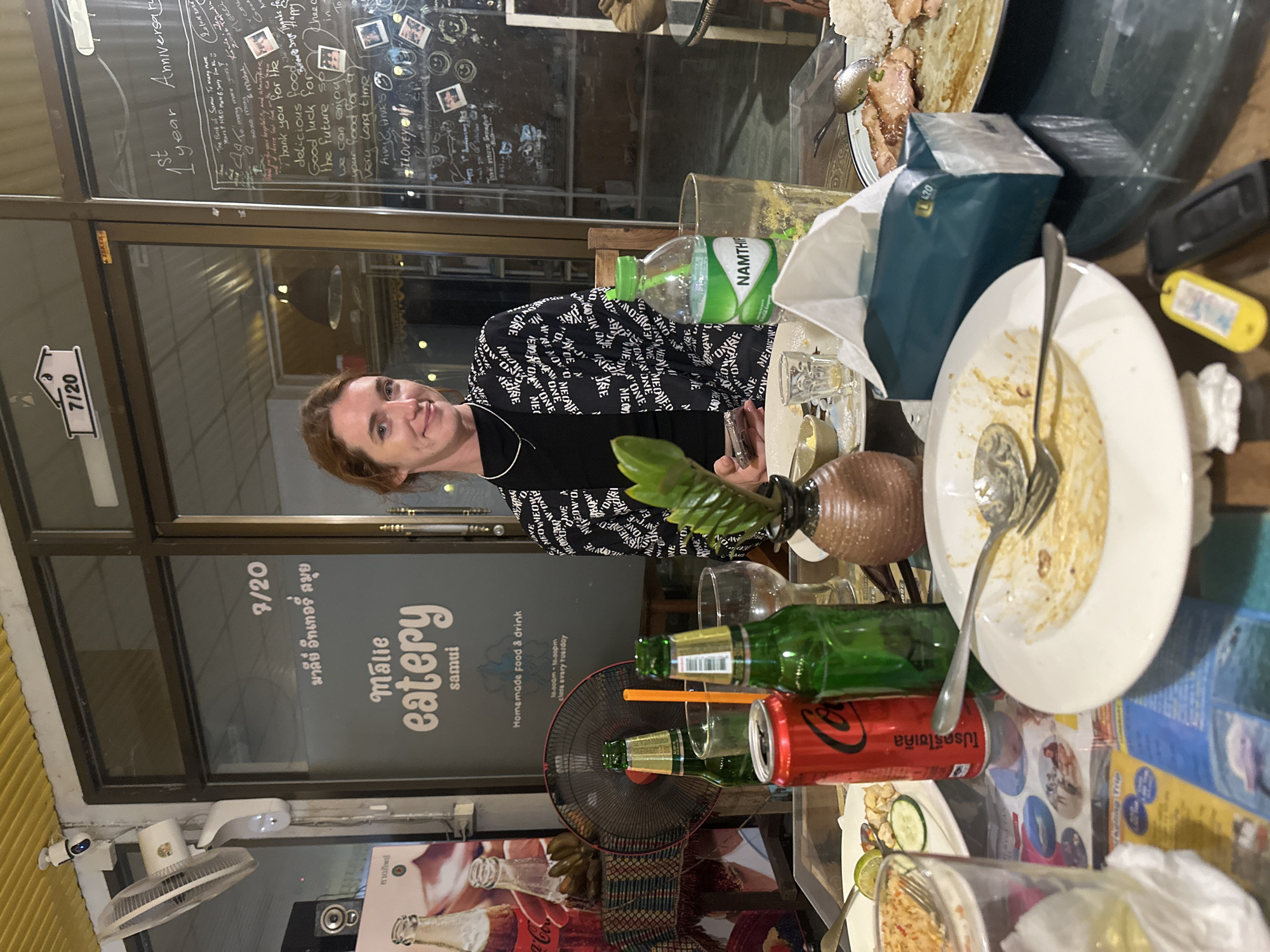 The image captures a scene at "Malie Eatery Samui" in Baan Tai, Thailand, as indicated by the visible signage. A woman is standing near a table, with plates, cutlery, a "Namthip" water bottle, and discarded beverage cans on it. The table also holds a vase with green leaves, tissues, and a key with a yellow tag. A standing fan is visible in the background. A glass window displays messages and photos marking the restaurant's anniversary. Another fan is mounted high on the left wall.