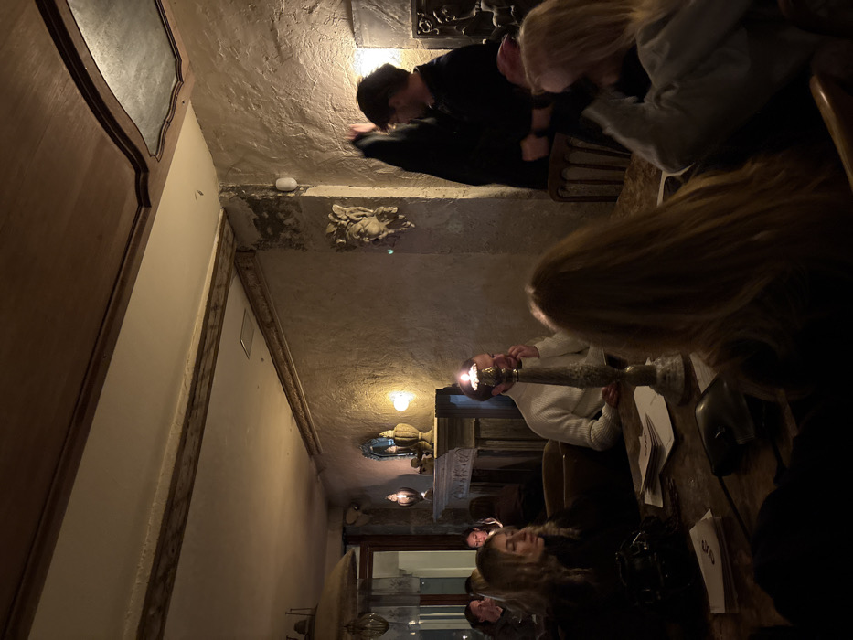 A dimly lit room, likely a restaurant, features textured, decorative walls and ceiling. People sit around a wooden table, including one with long blonde hair in the foreground. A man in a white sweater holds a large goblet with a light source, possibly a candle, inside. Two other people lean over a table at the top, and menus are scattered on the table. A doorway or window is visible in the background.