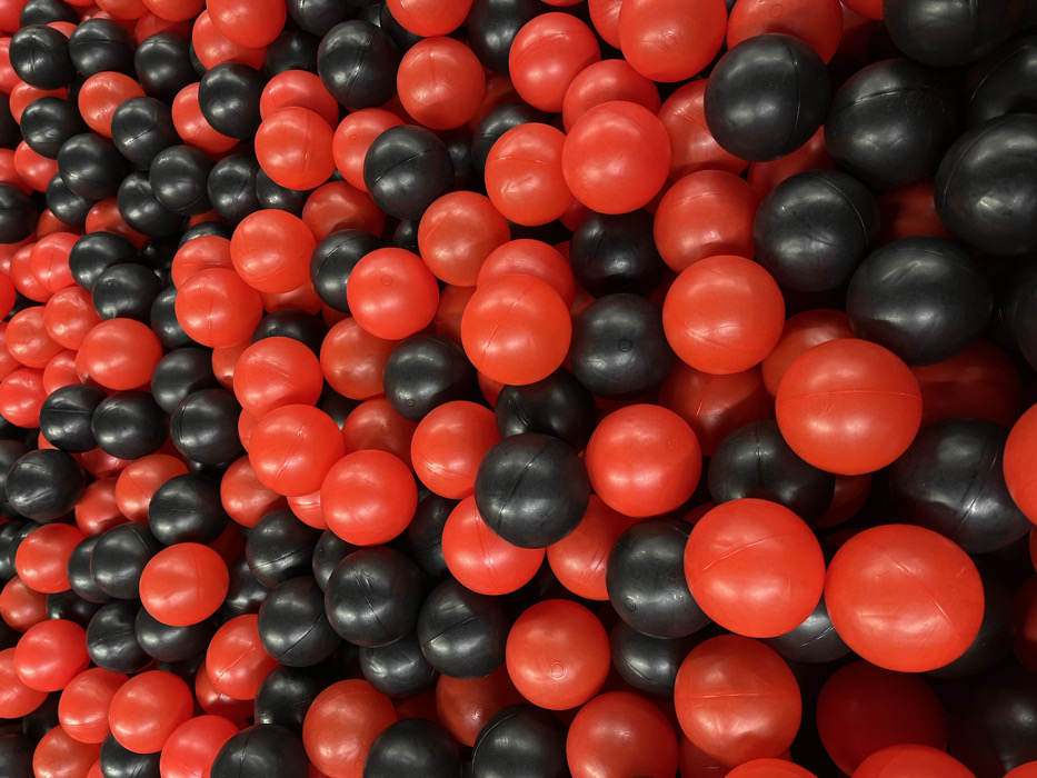 A densely packed arrangement of red and black plastic balls fills the frame