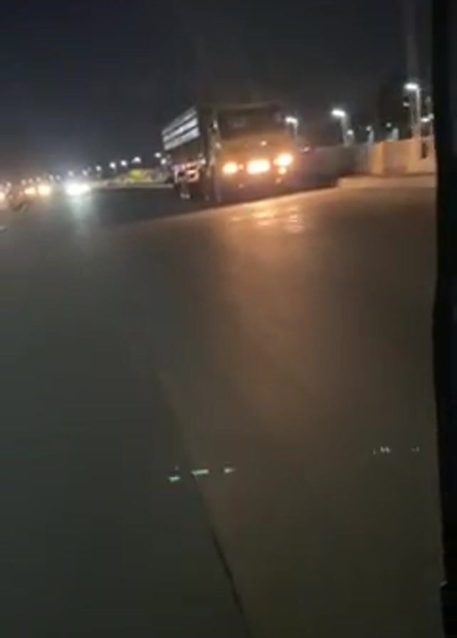 The video depicts a nighttime scene on a paved road, possibly a highway or wide street, with streetlights lining one side