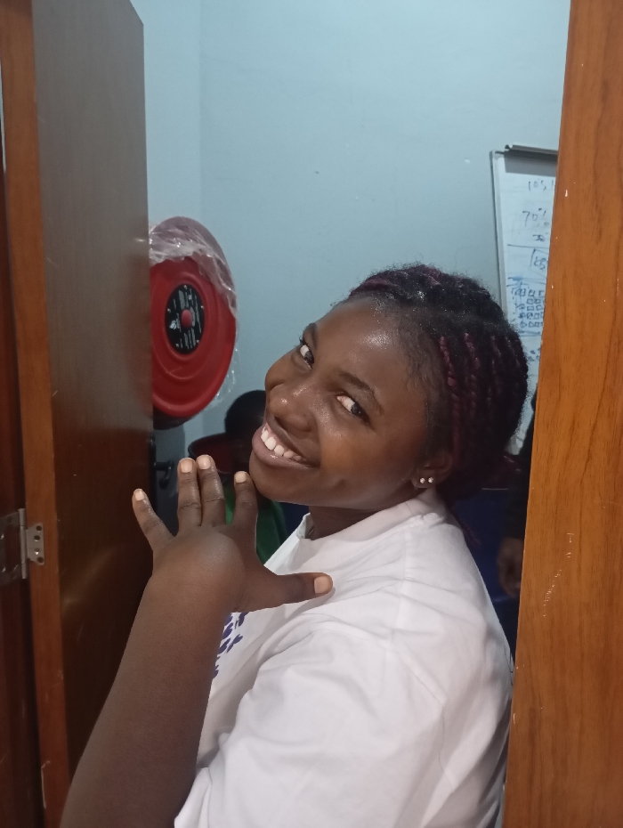 The image, taken in Jos, Nigeria, depicts a young Black female positioned centrally within a wooden doorway. She faces the viewer directly, smiling, with dark braided hair exhibiting reddish highlights. She wears a white t-shirt and small stud earrings. Her right hand is raised at chest level, fingers spread and palm facing forward. In the background, a light blue wall is visible. Mounted on this wall behind her left shoulder is a red circular object, possibly a fire alarm, encased in clear plastic. To the right, a portion of a whiteboard is visible, displaying obscured writing including numerical percentages. Faintly discernible blurred figures are present in the deeper background, one wearing a green garment.