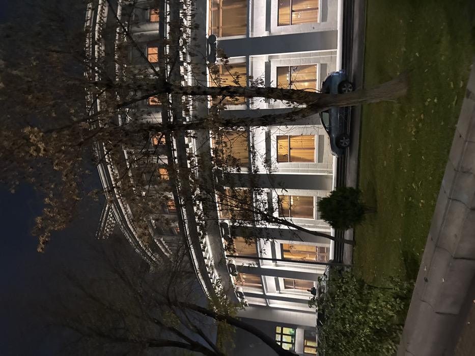 The scene depicts the Armenian National Academic Theater of Opera and Ballet named after Alexander Spendiaryan in Yerevan, Armenia, at night. The multi-story, light-colored classical building features a curved facade with prominent columns and multiple tiers. Numerous rectangular windows are visible across its surface, many exhibiting a warm, orange internal illumination. The building is brightly lit by external floodlights, creating a contrast with the dark night sky. In the foreground, several deciduous trees with sparse, autumn foliage partially obscure the building. A grassy area with scattered fallen leaves is visible at the bottom, bordered by a grey concrete curb and a paved surface. A light-colored SUV is parked on the paved area in front of the building, partially behind a tree trunk. To the far left, a dark-colored vehicle is partially visible behind some foliage, near which one individual is faintly discernible standing.