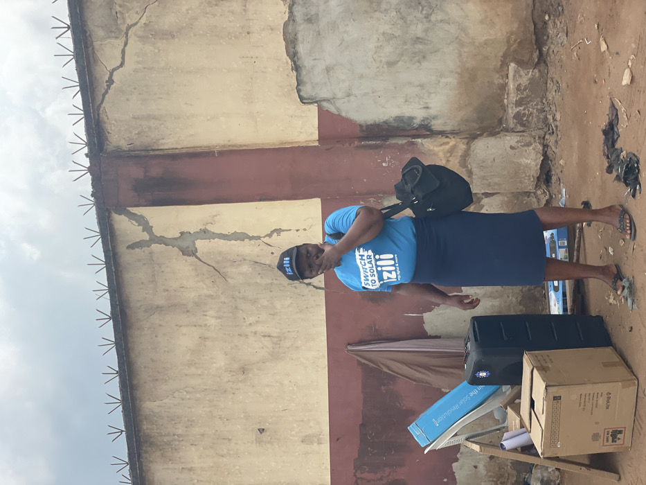 An outdoor scene in Ikoga, Nigeria, depicts an adult female standing in front of a weathered, cream-colored wall with a red base and upper trim. The wall exhibits significant cracking and areas of missing plaster. Anti-climb spikes are present along the top edge of the wall. The ground consists of loose dirt and scattered debris. The female individual is positioned slightly left of the image center, facing the viewer. She wears a blue short-sleeved t-shirt with "SWITCH TO SOLAR IZILI" text, a dark blue skirt, black flip-flops, and a black baseball cap with "izili" in white lettering. A black shoulder bag is slung over her left shoulder. Her right hand is raised, partially covering her mouth. Her gaze is directed towards the camera. To her left, against the wall, are several objects: a large blue panel or box, possibly packaging, displaying text that includes "The Solar Revolution"; a tall, black rectangular electronic device, possibly a speaker or power unit; and an open cardboard box labeled "BOLTL" with hazard symbols. A folded brown fabric or tarp is also visible leaning against the wall behind these items. Scattered small debris lies on the ground, including dark fabric pieces near the woman's feet. The sky is overcast.