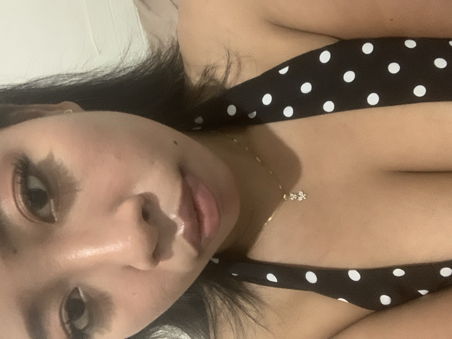A close-up, eye-level indoor portrait depicts a female subject, likely of Southeast Asian descent, positioned centrally. The subject has dark hair, dark eyes, and a neutral expression, looking directly at the camera. Makeup is visible, including defined eyelashes, eye makeup, and glossy lips. She is wearing a black garment with white polka dots, possibly a halter-neck top or dress, revealing her shoulders and cleavage. A thin gold-colored chain necklace with a small, clear-stoned pendant rests on her chest. The background is indistinct, appearing as a plain, light-colored surface, possibly a wall or soft furnishing. The lighting is uniform, suggesting an artificial indoor setting within the city of Denpasar, Indonesia. No discernible actions or interactions beyond posing for the camera are evident.