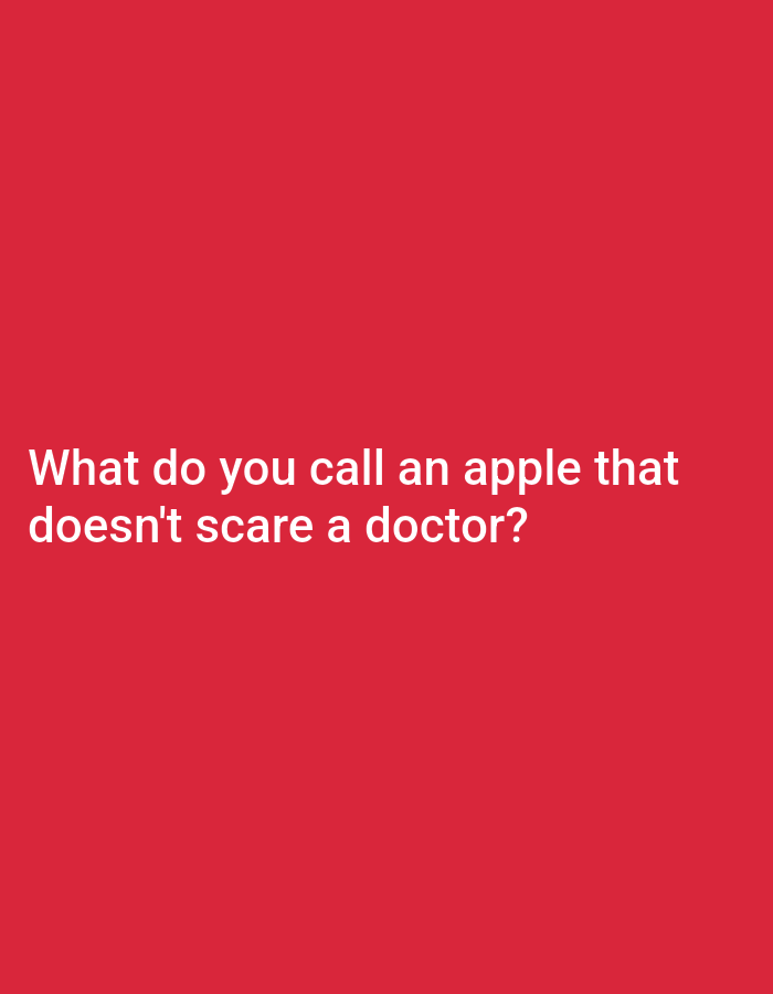 The image displays a solid red background. Centered on the lower half of this background is white, sans-serif text forming a question: "What do you call an apple that doesn't scare a doctor?". No other subjects, objects, people, actions, or interactions are present. The environment is a flat, monochromatic digital display. The image provides no discernable details to determine a physical location within Gwagwalada, Nigeria, or any other geographical area.