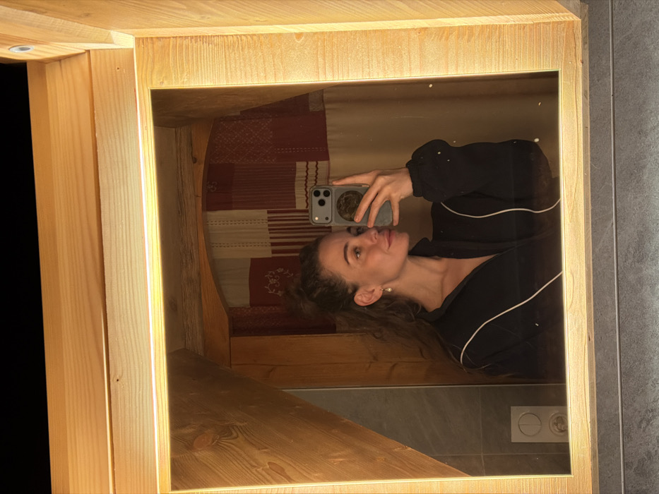 A selfie captured in a mirror framed with light wood. A woman with curly brown hair holds up a cell phone with a round grip on the back. She wears a black jacket with white piping. Behind her is a built-in seat or bed with a patterned fabric, and a gray tiled wall with a double light switch. The lighting in the mirror is warm.
