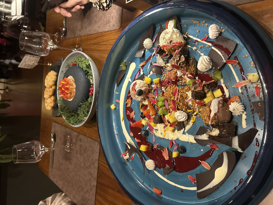 A large, blue plate showcases a dessert arrangement featuring ice cream scoops, chocolate pieces, fruit slices, crushed nuts, and dollops of whipped cream, accented with red petals and streaks of sauce. A separate dish holds a dark, circular cake surrounded by green foliage and adorned with red berries. To the side, small crackers sit on a black plate. Two wine glasses and silverware are placed on brown placemats.