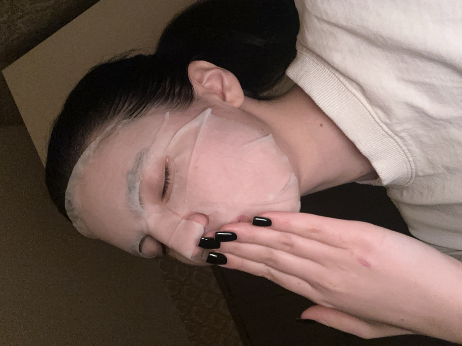 A person lies with a white sheet mask covering their face. They have dark hair pulled back in a bun and are wearing a light-colored shirt. Their right hand, with polished black nails, is positioned near their mouth. The background is a mix of tan and dark shades, possibly a couch or bedding. The image is softly lit, emphasizing the texture of the mask and the smoothness of the skin.
