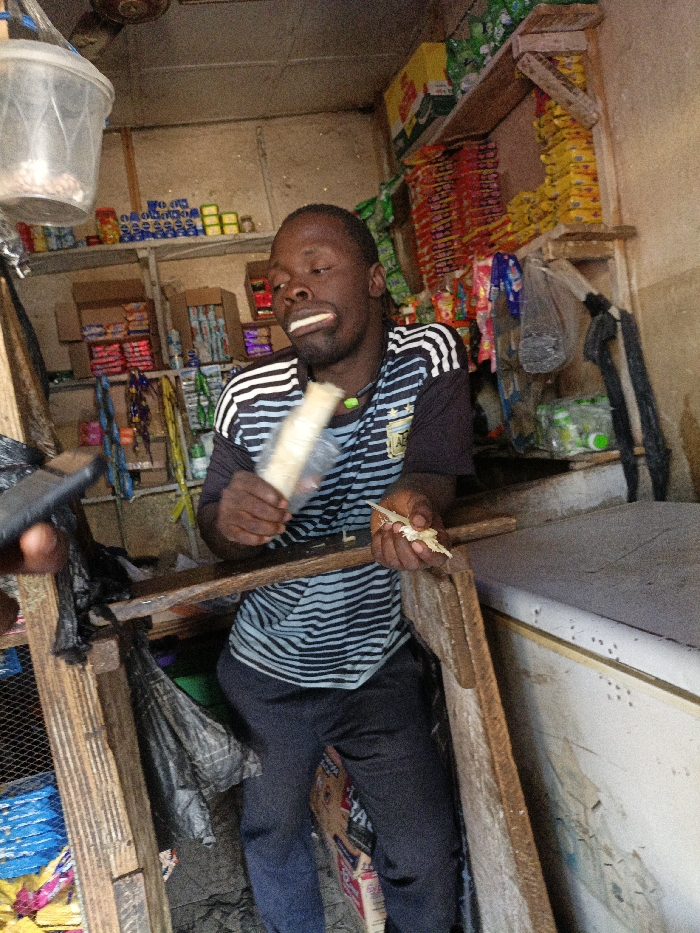 This image captures the interior of a small retail shop or kiosk in Gama, Nigeria. A Black male, appearing to be in his 20s or 30s, stands behind a rough wooden counter. He has short dark hair and a prominent white object covering his front teeth, resembling an exaggerated dental plate or prosthetic. He is wearing a short-sleeved shirt with light blue and white horizontal stripes on the torso and dark blue shoulders, featuring a light-colored emblem on the right chest, and dark trousers. In his left hand, the man holds a transparent plastic bag containing a light-colored, possibly granular substance. In his right hand, he holds a small, irregular, light-brown object. His gaze is directed towards the lower left, where a hand holding a dark-colored smartphone is visible, suggesting an interaction with the person holding the phone. The shop's interior features light-colored walls lined with multiple wooden shelves. These shelves are densely packed with various consumer goods, including stacks of brightly colored packaged items (red, yellow, green, blue) and cardboard boxes. A clear plastic container filled with small, light-brown items (likely peanuts) hangs from the ceiling in the upper left. Several black plastic bags are suspended throughout the space. To the right of the man, a white refrigerator or freezer with a grey top is visible behind the counter. The environment appears functional and cluttered, characteristic of a small, active convenience store.