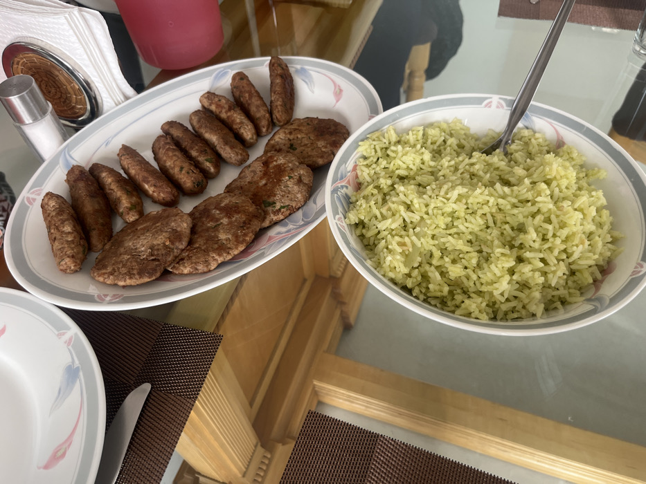 A table setting features a platter of grilled meats, including oblong sausage-shaped pieces and flattened burger-like patties. Next to this is a bowl filled with a heaping portion of light green rice, with a spoon inserted. Other visible items include a salt shaker, a red-colored drink, a stack of napkins, and a plate with a knife. The setting is on a glass-topped table with a brown woven placemat underneath.