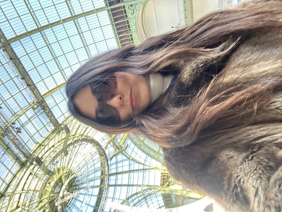 A female subject is centrally positioned in a close-up, slightly upward-angled portrait. She possesses long, dark brown hair extending over her shoulders and chest, and wears dark, oversized sunglasses, a white turtleneck, a blue garment, and a dark brown fur coat. Her facial expression is neutral. The background features the distinct interior architecture of the Grand Palais des Champs-Élysées in Paris, France. A vast, intricate glass and light-green painted steel framework forms a domed skylight and extensive ceiling structure, comprising numerous rectangular glass panes, which provides natural overhead illumination. Architectural details of an interior upper-level walkway with railings are visible in the distant background.