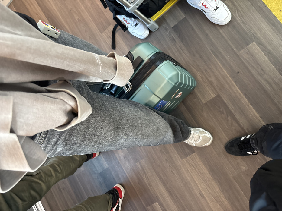 The image displays an overhead view of multiple individuals and their luggage on a dark wood-effect floor, consistent with a public transport terminal or vehicle in Seville, Spain. Centrally, a person wears a light gray long-sleeved top with rolled cuffs, dark gray jeans, and light grey mesh sneakers. A teal hard-shell suitcase with black trim, featuring a European Union flag sticker and a TSA lock icon, rests beside their left leg. To the immediate left, the lower legs of a person are visible, dressed in olive green pants and black sneakers with red and white accents. In the foreground, the feet of another individual are seen, clad in black pants and black Adidas sneakers with white stripes. To the right, white sneakers with red accents, a black backpack, and a yellow-framed object (possibly a luggage cart or stroller) are partially visible. The individuals appear to be standing or waiting; no explicit interactions are depicted.