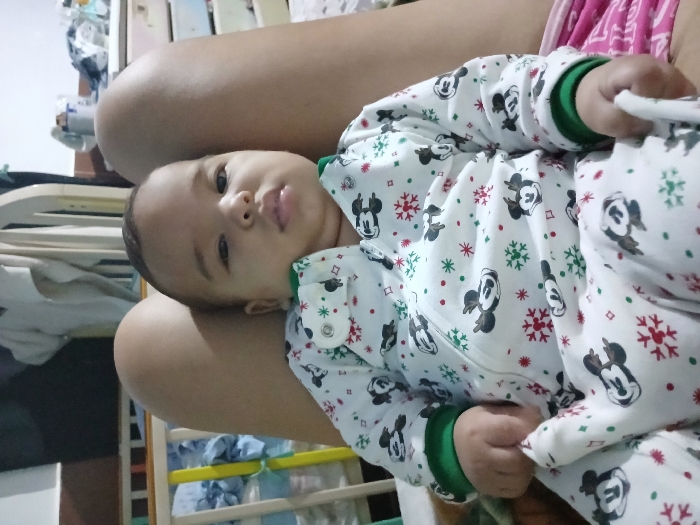 An infant is positioned centrally between the bare upper thighs of an adult, in an indoor domestic setting located in Juan Griego, Venezuela. The infant, with dark hair, faces directly towards the viewer, making eye contact. It wears a white, long-sleeved one-piece sleeper featuring a repeating pattern of black Mickey Mouse heads, red snowflakes, and green snowflakes; the sleeve cuffs are green. The infant's hands are visible near its torso, with a portion of the sleeper's fabric held loosely in its right hand. The adult's legs are light-skinned. In the blurred background, to the left of the infant's head, part of a light-colored wooden crib or bed frame is visible. To the right, a white piece of furniture, possibly a dresser or shelving unit, contains various items, including white containers and draped clothing.