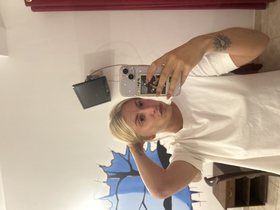 The scene is an indoor room in Thissamaharama, Sri Lanka, captured as a mirror selfie. The primary subject is a blonde-haired female, appearing to be in her 20s or early 30s, wearing a white short-sleeved t-shirt. Her face exhibits a pinkish flush on the cheeks and nose. She is actively posing; her left arm is raised, with her hand touching the back of her head, revealing a tattoo on her left upper arm. Her right hand holds a light-colored smartphone, equipped with a clear, heart-patterned case that contains a small printed photograph of two individuals. A circular tattoo, possibly a mandala design, is visible on her right forearm. The background, reflected in the mirror, consists of a white wall adorned with a blue and black tree-like mural on the left side. A dark-colored CRT television is mounted on the wall to the right of the mural, with associated wiring visible. Partially visible on the left are a dark wooden bedside table with shelves and a dark wooden chair. A section of a red curtain is visible along the right edge of the reflected image.